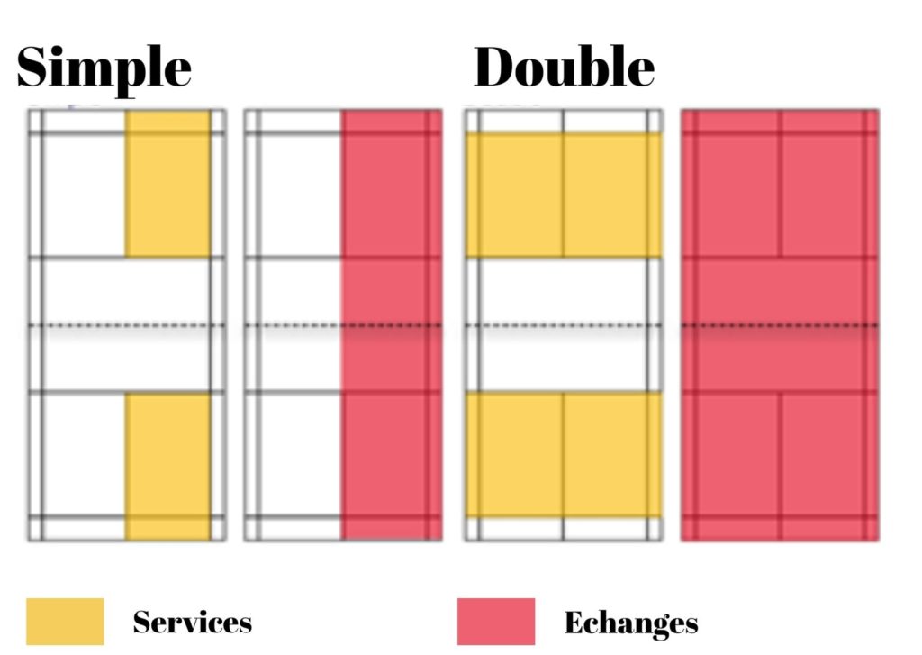 Un match se joue en 3 sets. Pour gagner un match, les joueurs doivent gagner deux sets. Chaque set se joue en 21 points, sauf si le score atteint 20-20. A ce moment-là, le jeu continue jusqu’à ce qu’un joueur mène avec 2 points d’écart. Si le score atteinte 29-29, le vainqueur du point suivant gagne le set.